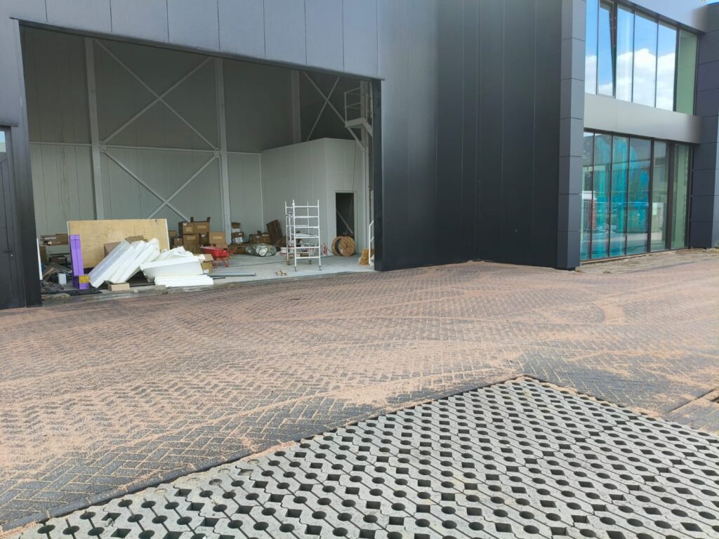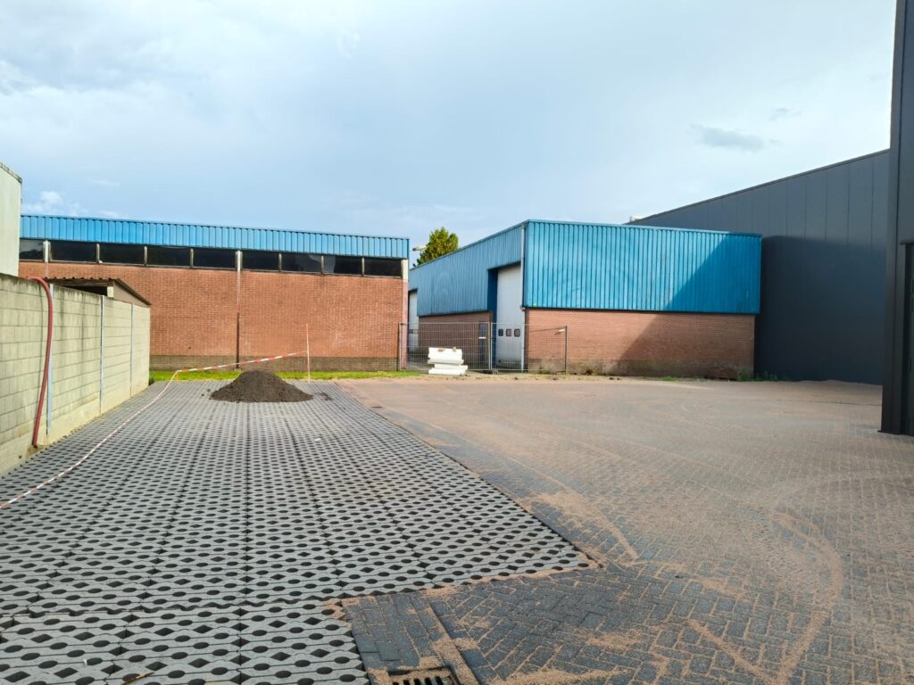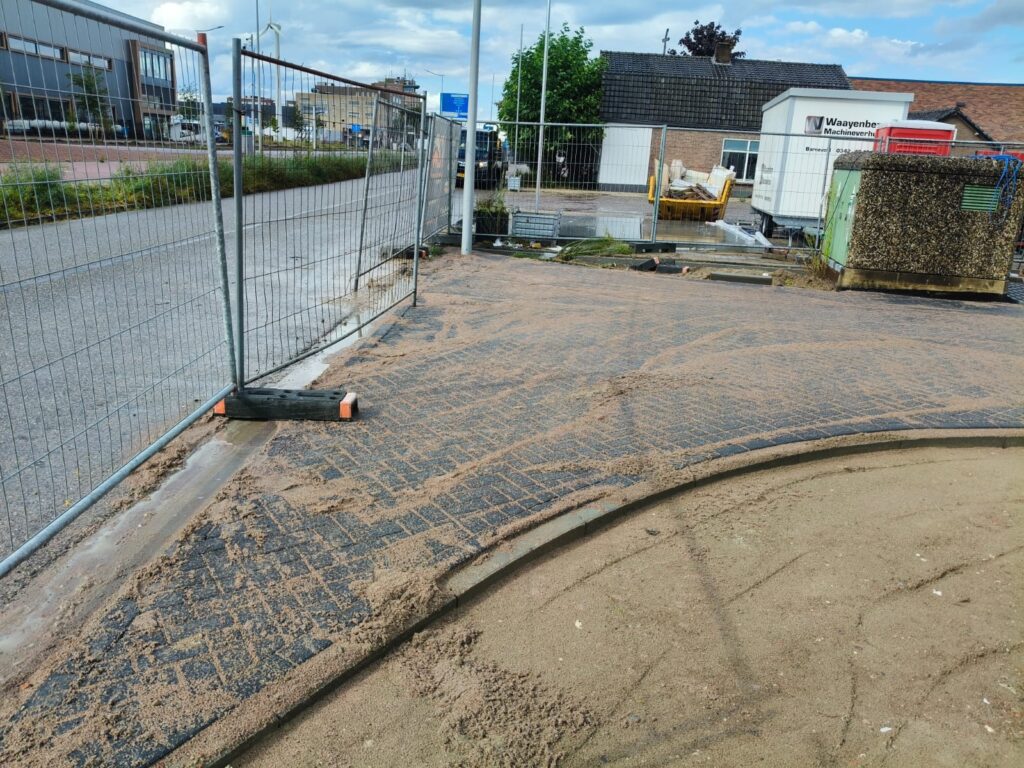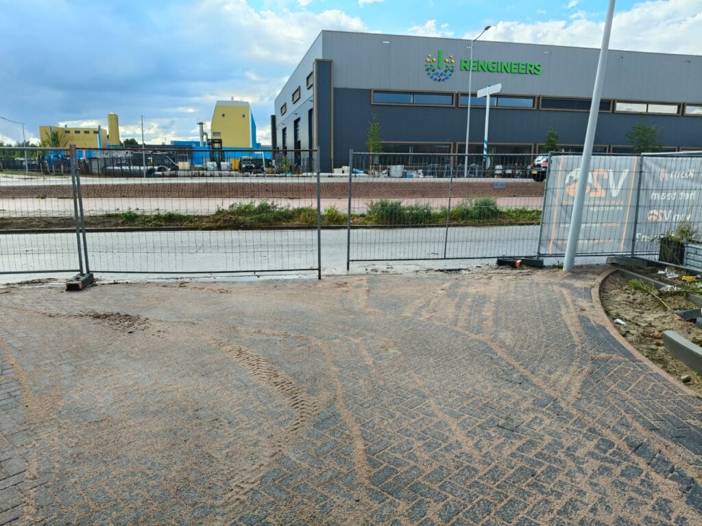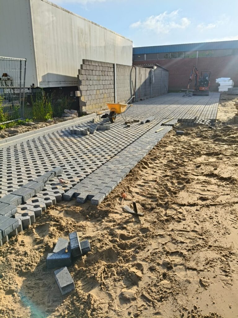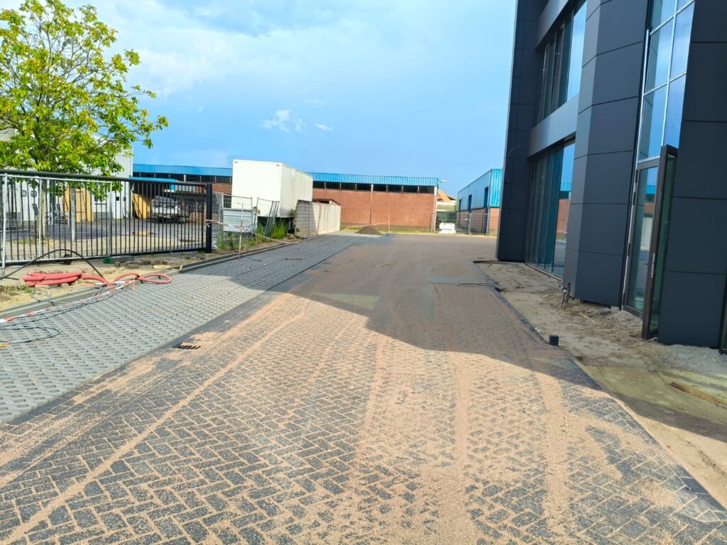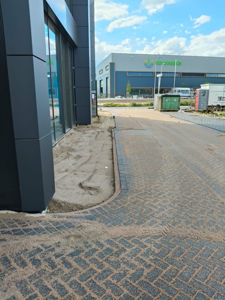 Bij Jumbo Kozijnen in Barneveld hebben wij het terrein ingericht met het oog op zwaar gebruik en langdurige belasting. Het straatwerk is aangelegd in keperverband, een bewuste keuze voor maximale stabiliteit bij het intensief in- en uitrijden van vrachtwagens.